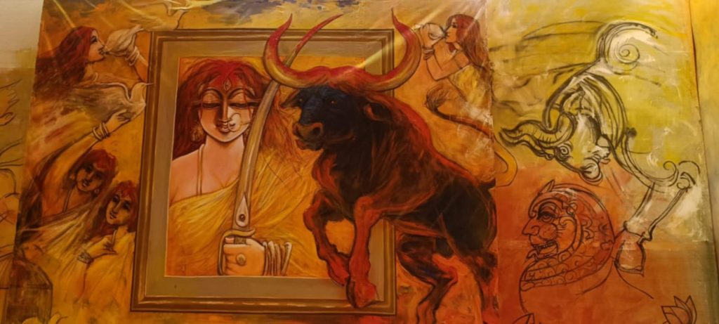 আমি এখানে জল তুলির মধ্য দিয়ে নারী শক্তি রূপে দেবীর যে ফুটিয়ে তোলার চেষ্টা করেছি, তার একটি রুহ হল শিব ঠাকুরের কাছে দুর্গা। অশুভ শক্তিকে আলোর পথে আনা, মহিষের তীব্র আক্রমণকে দেবীর রুখে দেওয়ার শুভ শক্তি। এই ভাবেই একটি চিত্র “জাগরী” ভাবনার মধ্য দিয়ে তুলে ধরার চেষ্টা করেছি, সবাই আসুন দেখুন আপনাদের মতামত দিলে তবেই উদ্যোক্তারাও একটি শিল্পী এগিয়ে যেতে পারে। এবং আগামী দিনের নতুন ভাবনা নিয়ে আসতে পারে।